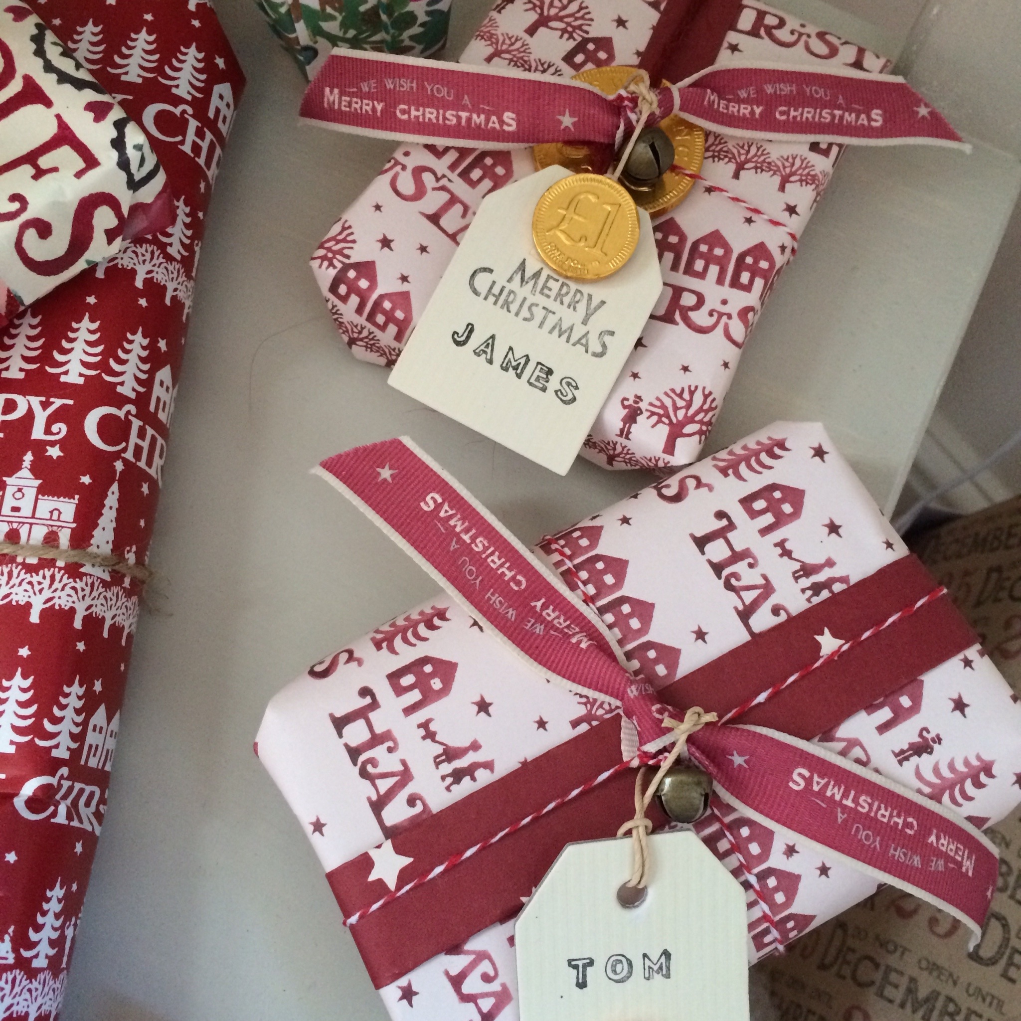 Sainsbury’s candy stripe wrapping paper (£2 for 4m roll), ‘Merry Christmas’ tape from Paperchase (£1.50), Muscial Santa toy from Sainsbury’s (£1.99), East of India tags as before