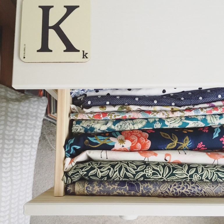 My fabric stash in this drawer is just bigger pieces – yardage for dresses or scraps big enough for ties and small projects. I keep tinier scraps for cards separately. Most of my stash is left over from dresses I’ve made. I don’t often buy a fabric and not already have a garment in mind so it never sits there for long.