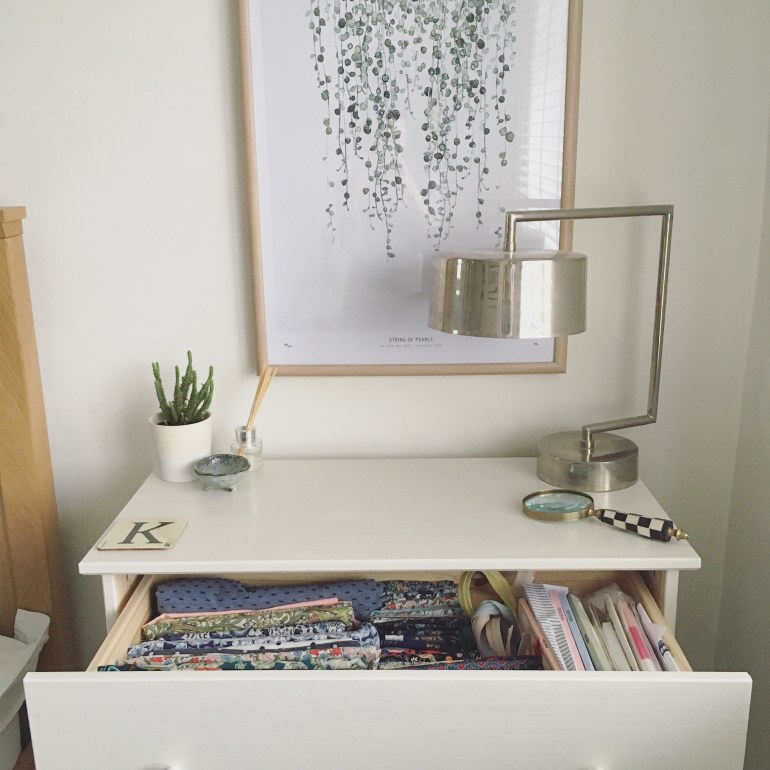 I think the key to incorporating your crafting space into a bedroom or living room is not to disturb the style of the room. The fabrics I buy and clothes I make are generally bright and patterned and that’s almost the polar opposite to my interior style; I like my interiors calm and clean. So whilst if I had a dedicated sewing room I’d love to display my fabric stash, in this room it just doesn’t fit so I’ve incorporated it in with my other bedroom storage.