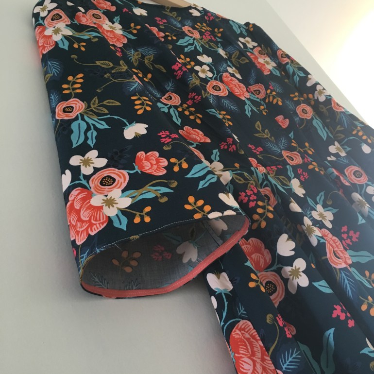 I chose to bind the collar and sleeves in coral pink bias binding which makes it feel a bit more finished. The binding was linen which actually helped to add some structure to the rayon which is particularly effective on the sleeves.