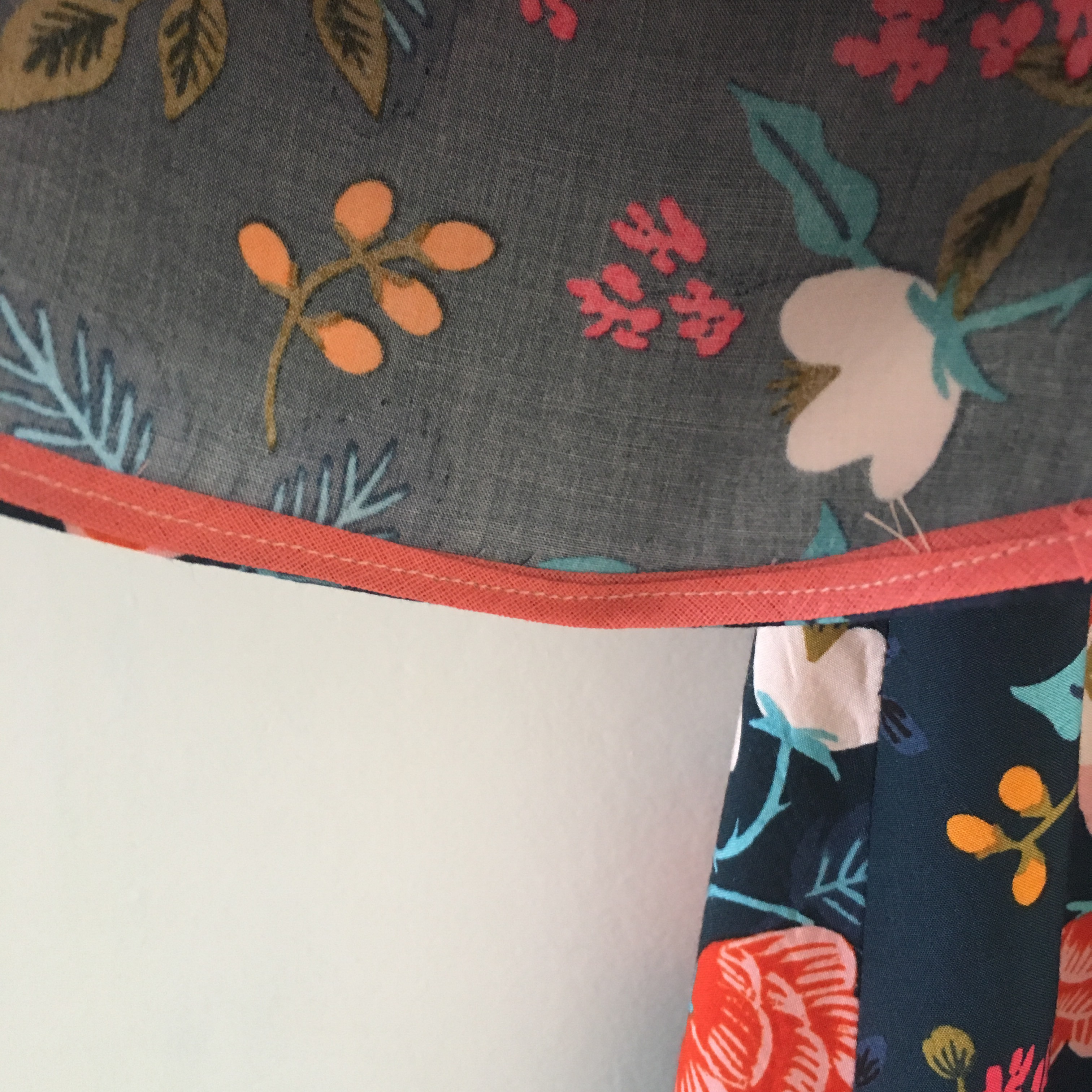 I chose to bind the collar and sleeves in coral pink bias binding which makes it feel a bit more finished. The binding was linen which actually helped to add some structure to the rayon which is particularly effective on the sleeves.
