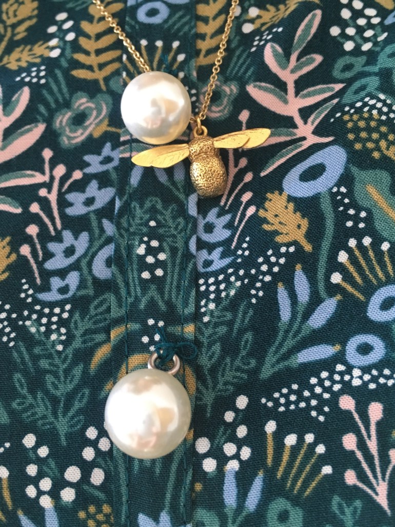 To do the button placket I cut the front piece on the fold and stitched straight down with the fabric still folded in half. I then ironed it flat and stitched at each side of the button placket. I added some big pearl beads from eBay.