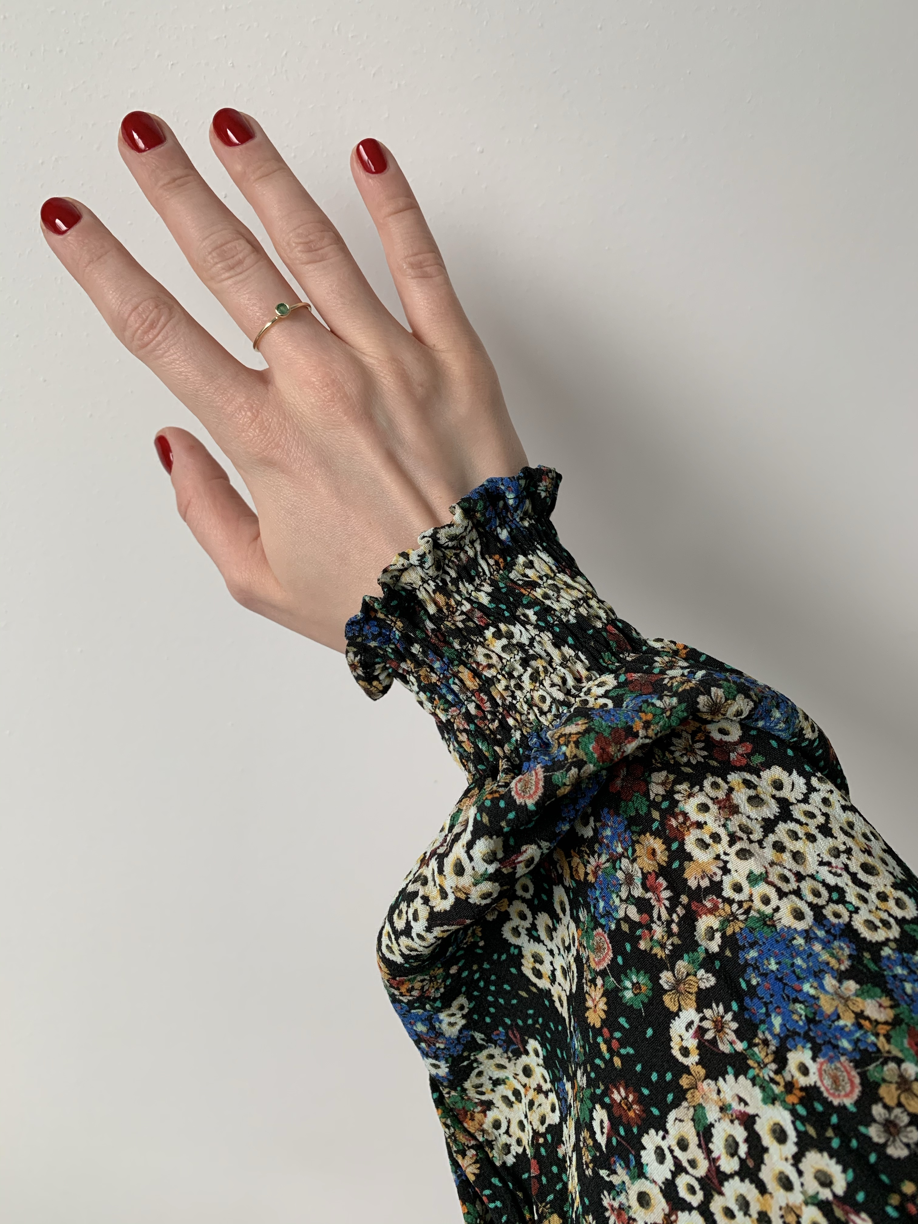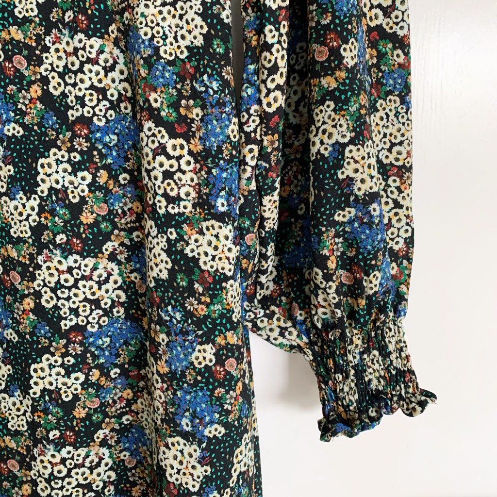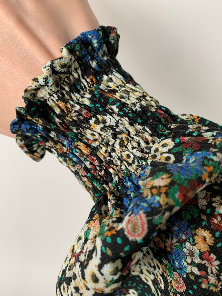 And as for the sleeves, I used the By Hand London Hannah sleeves which I’ve used in a few hacks recently and I just absolutely love. I wanted to add shirring this time because I thought it would really suit the fabric. I cut them a little longer, maybe 4cm, and sewed the shirring before sewing up the side seam of the sleeve so I could fit it at the wrist. Although I had a vague idea of where to start, I have a habit of missing out vital steps by not reading instructions so this time I googled it and stumbled across an excellent YouTube video by the Stitch Sisters – linked here. It was an excellent intro and had great tips like steaming the elastic to help it shrink. I had to make the sleeve a bit narrower so it was fitted at the cuff so I just sewed it to taper off after I’d sewn the 7 lines of shirring, and I’m pretty happy with the shape since there’s still enough volume in the sleeve itself.