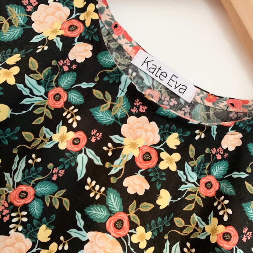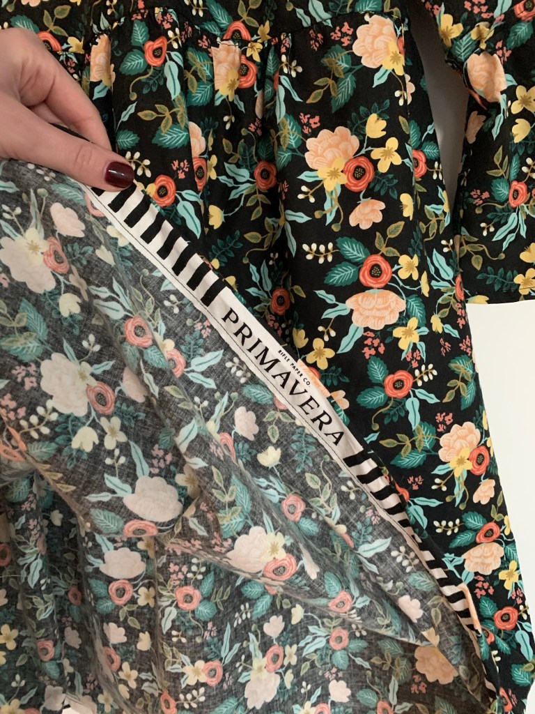 I used bias binding to finish the neckline mainly because the fabric is already quite thick. I used a contrasting Rifle Paper Co print. For the hem, I’d cut the skirt along the selvedge – I always try to preserve it in Rifle Paper Co prints because it’s so pretty. I just folded it up one and stitched it so you can still see it on the inside.