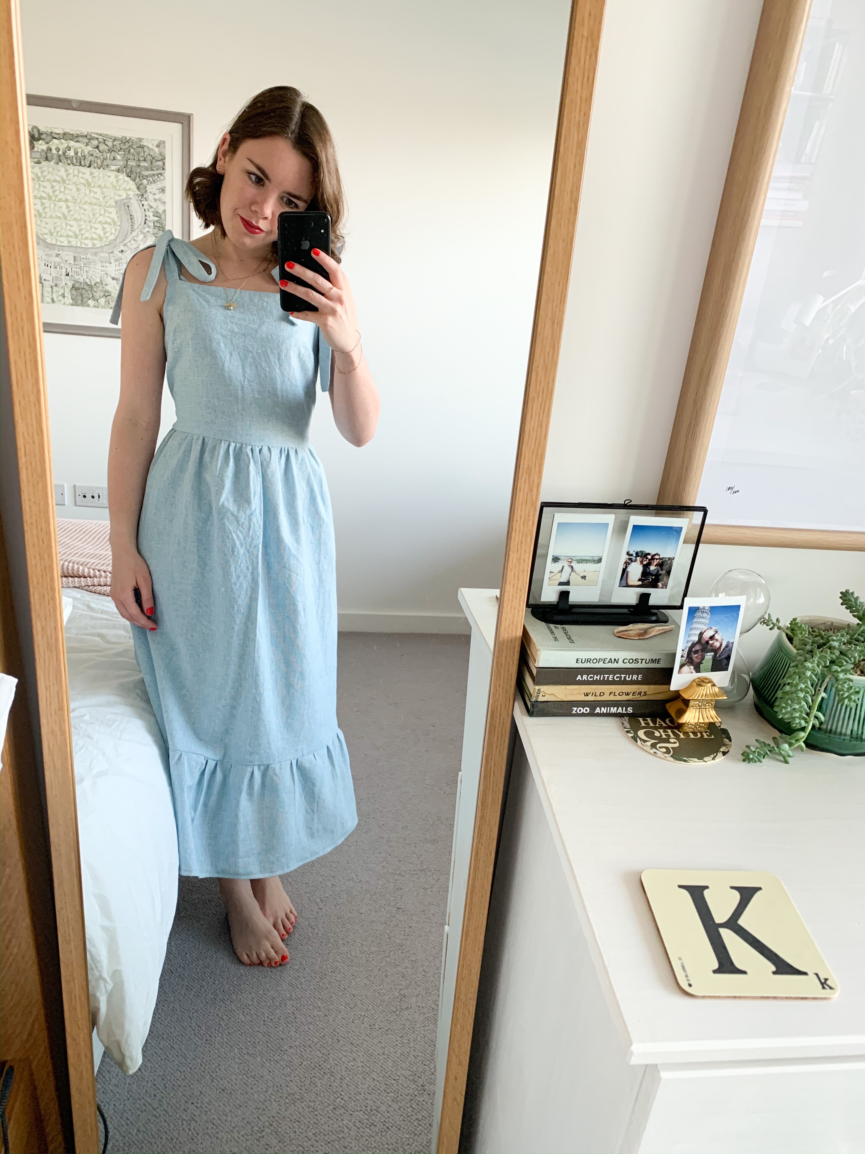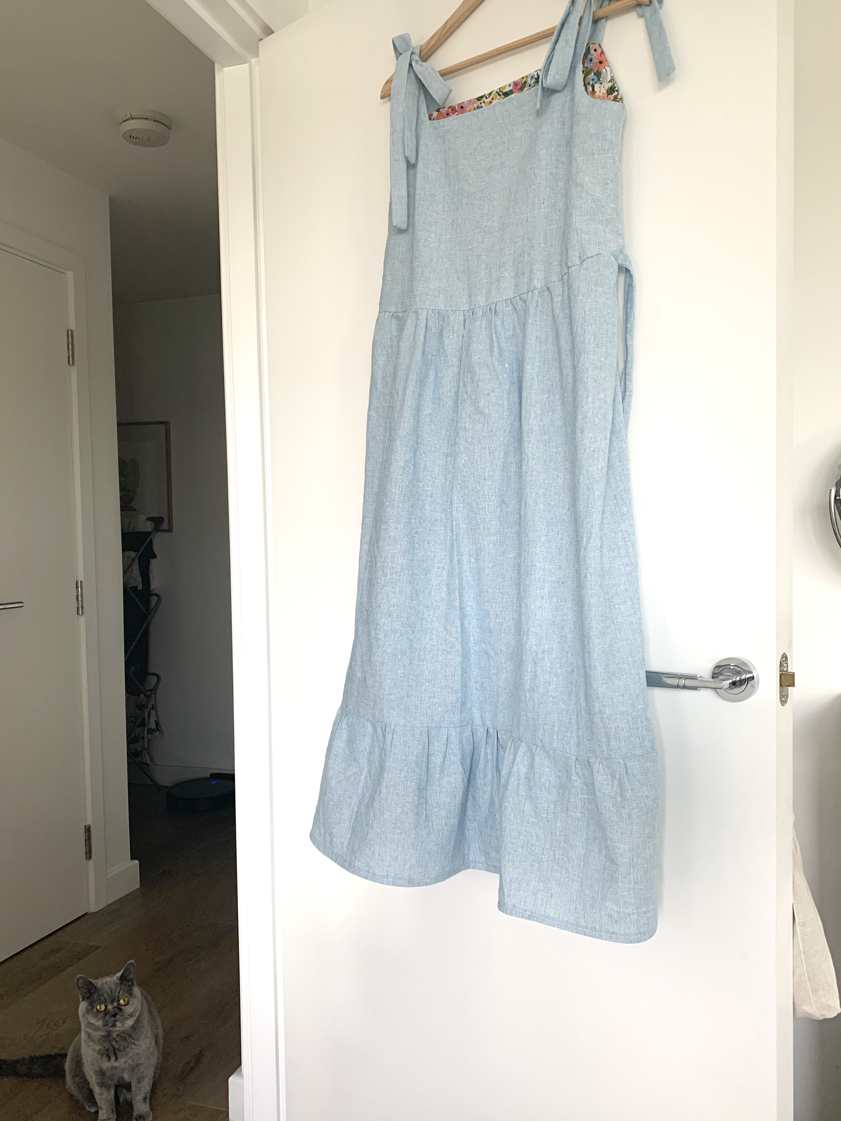 To enable it to get over my head, I made the same size as usual but I didn’t sew up the waist darts on front or back, I just sewed the bust darts. Also having tie straps helps get it on and off really easily.