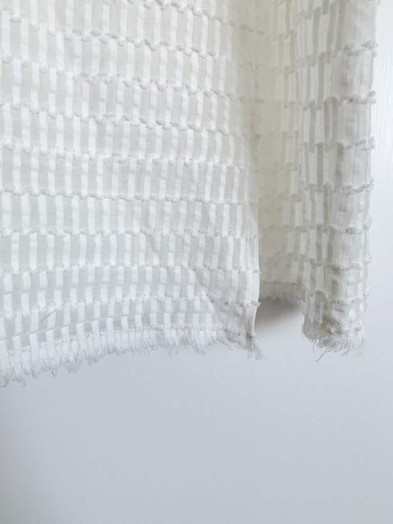 As for the dress itself, I really took my time over it as I wanted to do the fabric justice so there are a few little features I’m quite proud of. I french seamed the whole thing including the sleeves. I also used satin bias binding on the neckline. There was some careful pattern placement of the skirt piece so I could preserve this beautiful frayed edge – I obviously didn’t hem it but I did stitch a line close to the edge of the fray just to make sure it doesn’t fray more.