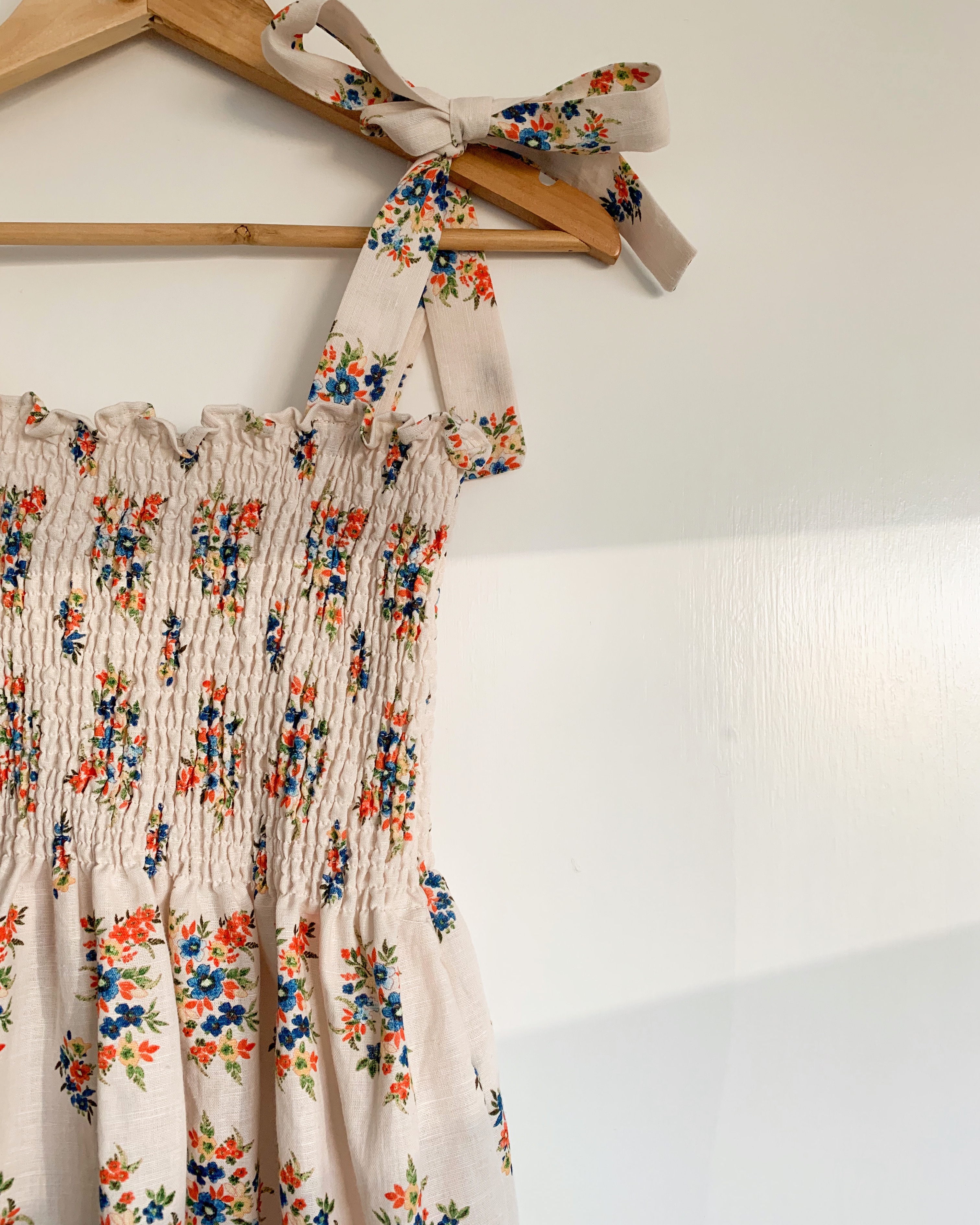 The fabric was so lovely to work with, and it had this lovely frayed edge which I really wanted to keep – I made sure the dress was the right length before I hemmed the top and started shirring, so I could leave the hem raw. To stop it fraying any more, I sewed a straight line close to the fray.