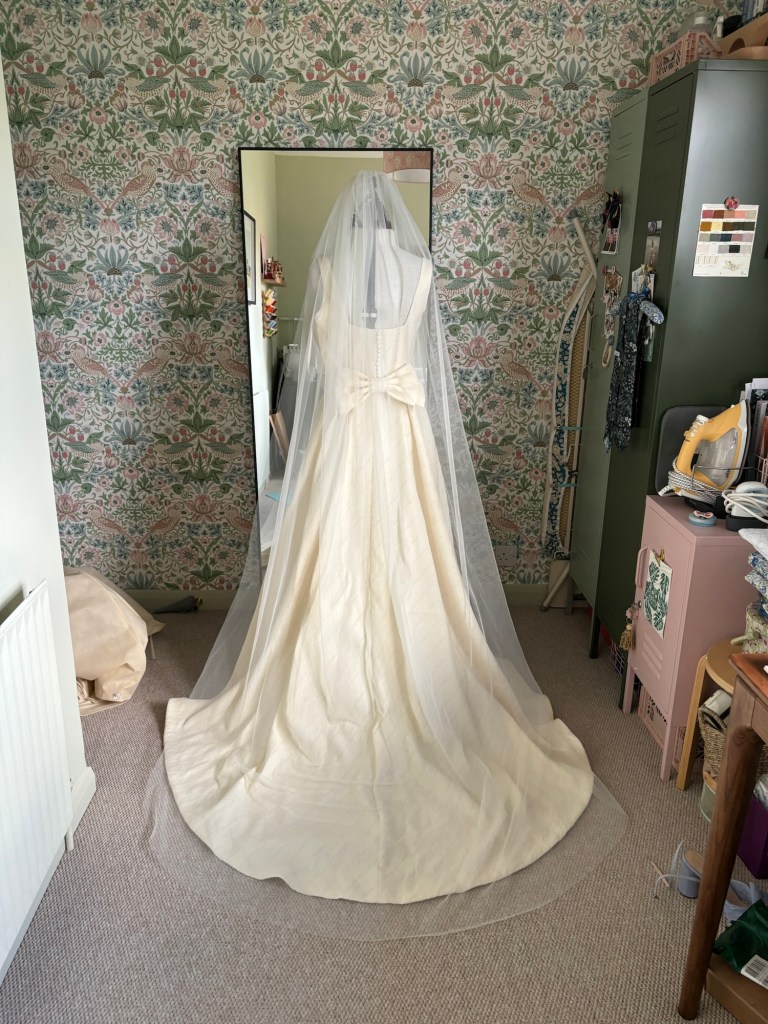I bought a comb off Etsy that already had a ribbon attached and I just gathered up the fabric on my machine then hand stitched it to the comb. I cut it right at the end when I put the dress on my mannequin (had to improvise for the head with a tripod) and I then trimmed it by hand to mimic the hem of the skirt. Looking at the pictures I’m glad I made one, though I would say I did find it a faff to wear and it came off after about 20 minutes!