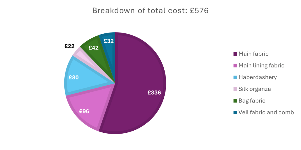 Disclaimer: I received a discount on my New Craft House main fabric but paid full price for the rest, so my cost for the dress was around £450. The cost I’ve included here is the full price of the fabrics to give a realistic view on the total cost of the dress.
