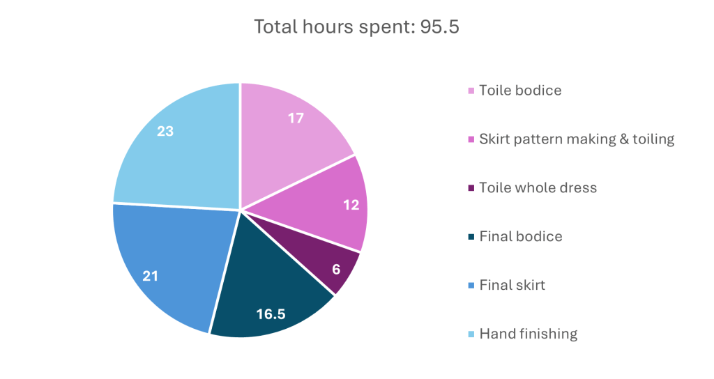 Whilst I was quite accurate on the sewing time needed, I massively underestimated the thinking time; not captured in the chart below are the hours and hours sat on the Tube on my way to work looking at pictures and thinking about my next steps. So if you’re planning a special make, definitely factor in some buffer time for mulling over your design. Below is the breakdown of each step and how long it took me spread over multiple sewing sessions. Surprisingly, only 39% of my time was spent at my sewing machine on the real dress; the rest was toiling and hand sewing (& faffing).