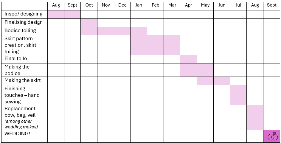 I started about a year before the wedding, with an aim to have the dress mainly finished 2-3 months before (so that I could not worry about it, and also so I had a bit of time to make other things like the ties, wedding stationery and my second dress for the evening.